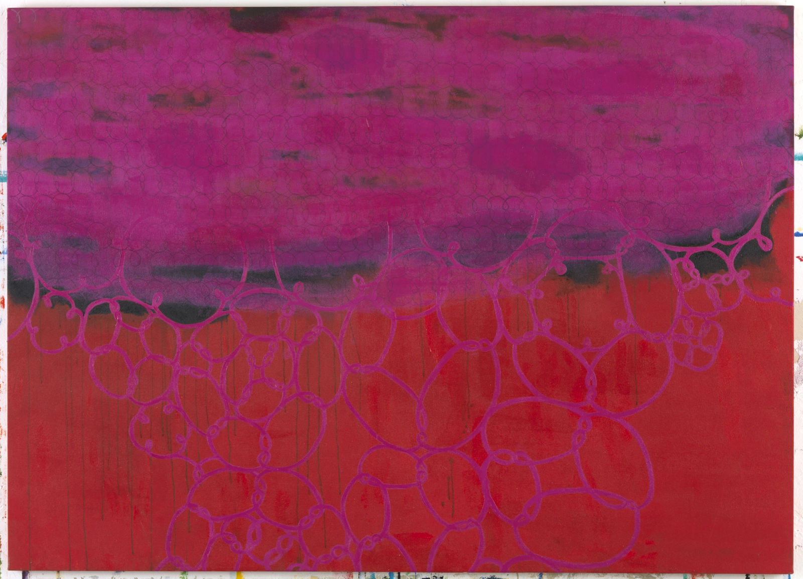 A artista cria paisagens, povoadas ou não, que geram uma trama em um espaço indefinido. Muitas vezes em forma de arabescos, esta trama parece querer conter um céu que está sempre prestes a verter sobre nós, indicando o estado efêmero da natureza e dos seres humanos.