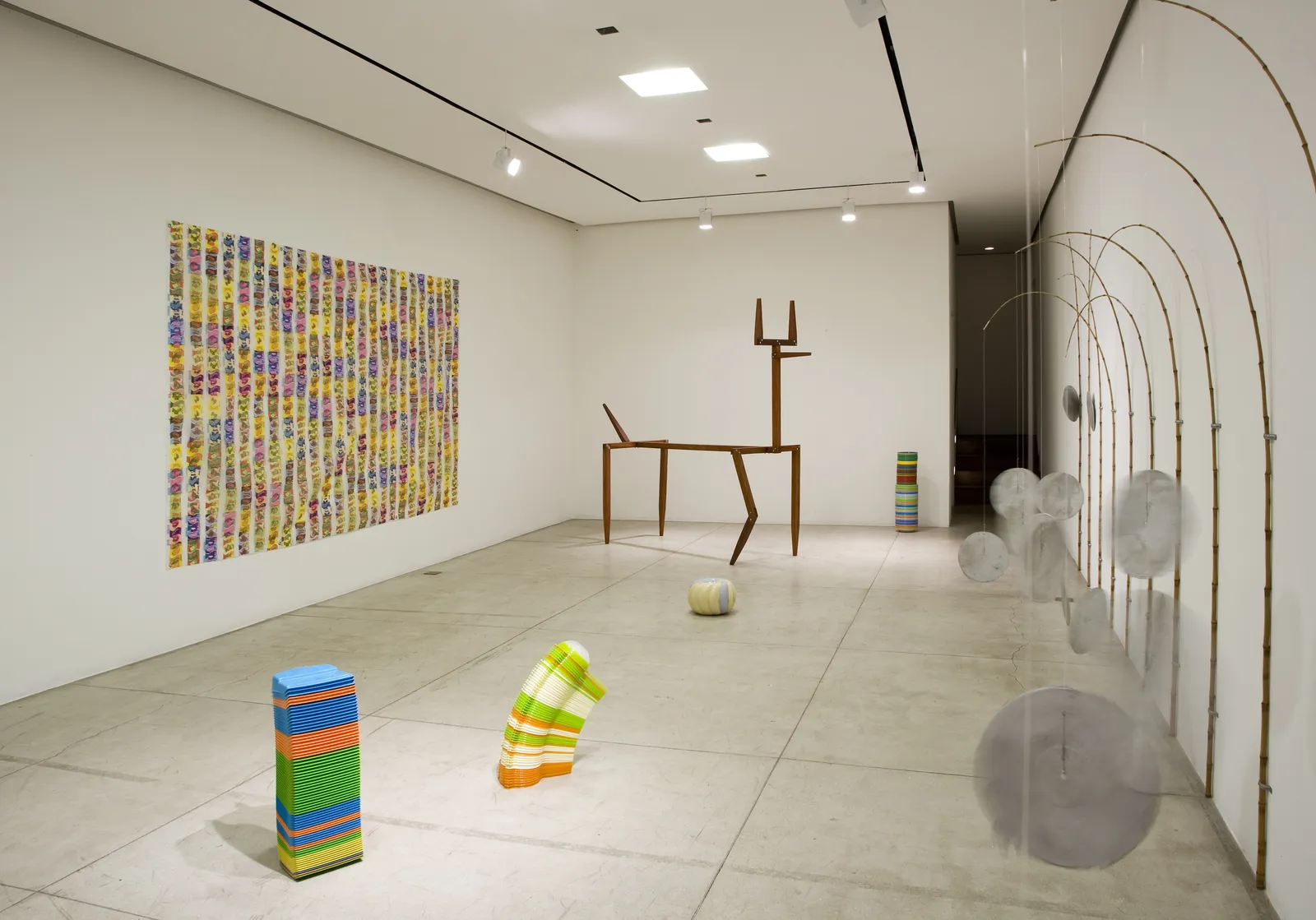 A exposição ocupa todos os espaços expositivos da galeria: no primeiro piso, o artista apresenta uma alegoria em grandes dimensões. Tratam-se de esculturas feitas em estrutura de madeira, parafusos, palha e 1.100 cata-ventos de papel de presente. Neste andar, o artista ainda mostra a obra “Boa pesca”, sugerindo pesquisas a cerca da música popular brasileira. Os discos, fundidos em alumínio, são suspensos por varas de pesca de bambu e discutem também a reciclagem ecológica e das mensagens dos conteúdos das obras musicais. Ainda neste piso, o artista mostra série de trabalhos formados por objetos de plástico coloridos, como pás, pratos, baldes e outros. Ele enfatiza a seriação destes utilitários ao empilhá-los e mostra novos pontos de vista ao realizar composições cromáticas e criar novos formatos.